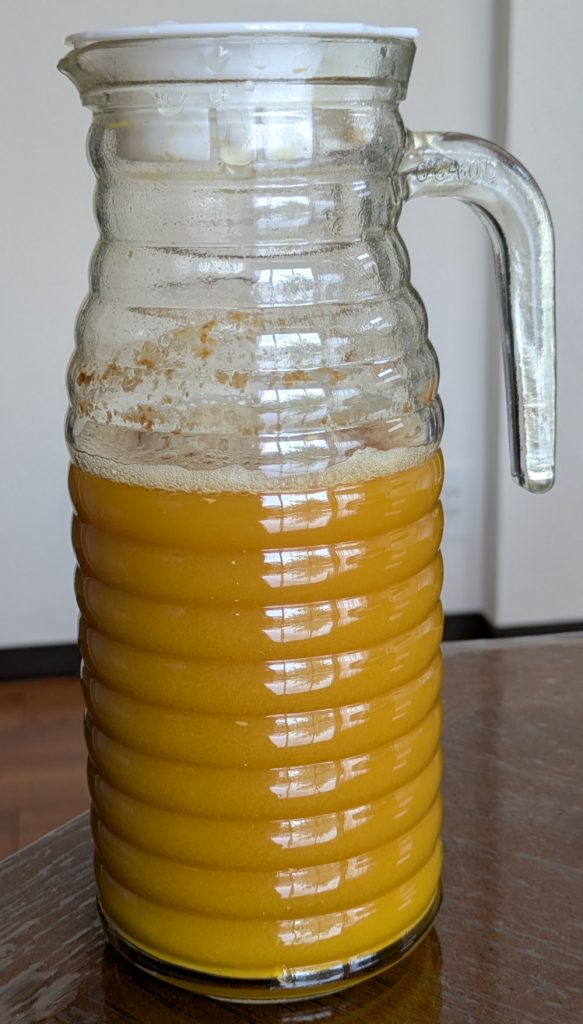 1日置くとポンツクショウガ粉末の不溶解分は沈殿し、上澄みはココナッツシュガーによって褐色になります。